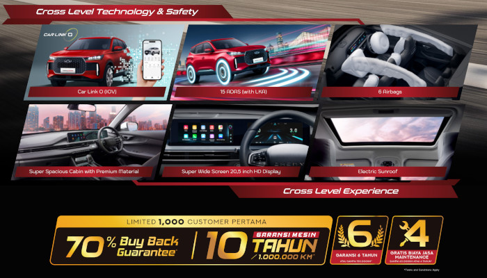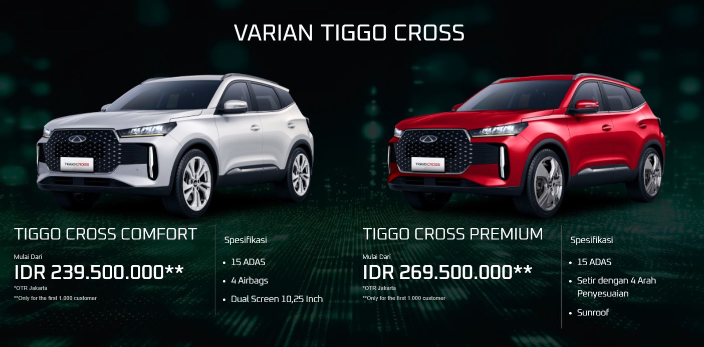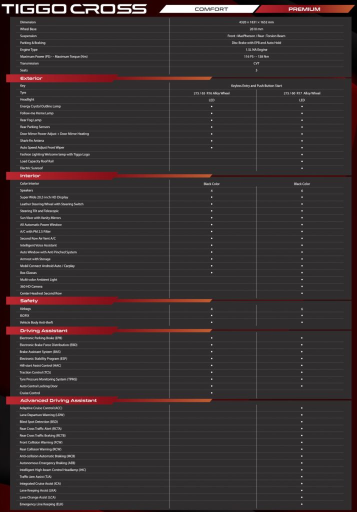 Fitur unggulannya mencakup layar ganda 10,25 inci dengan Apple CarPlay dan Android Auto, serta sistem keselamatan canggih seperti enam airbags dan teknologi ADAS. Tiggo Cross tersedia dalam dua varian, Comfort dan Premium