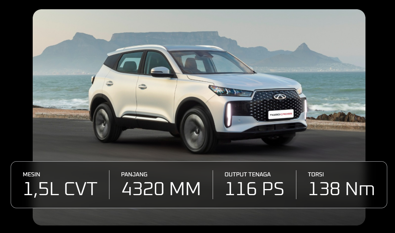 Chery Tiggo Cross adalah SUV crossover terbaru dari Chery yang hadir dengan desain modern dan fitur canggih. Mobil ini dilengkapi mesin 1.5L Naturally Aspirated dengan transmisi CVT, menghasilkan tenaga 114 dk dan torsi 138 Nm.